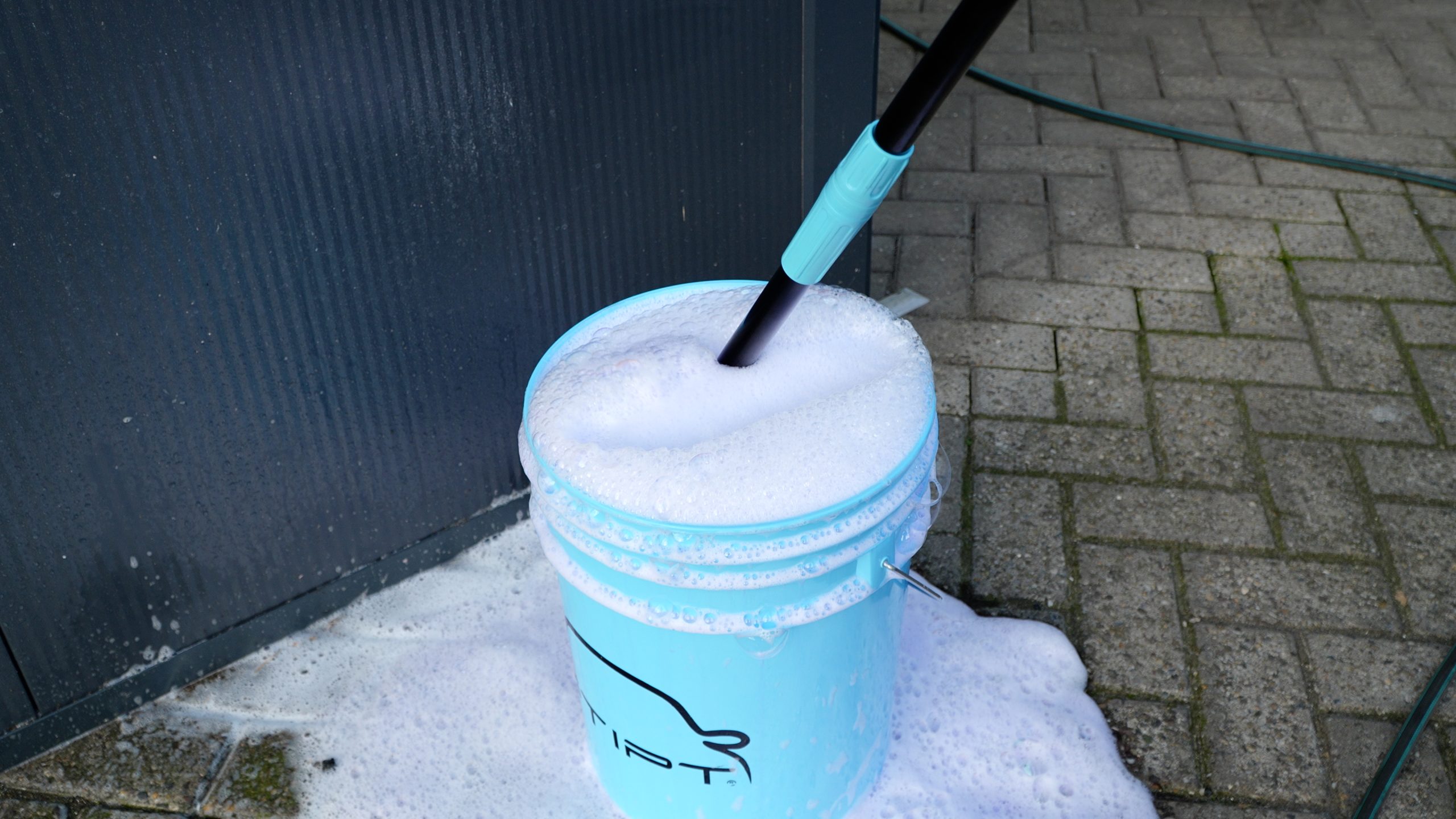 Attach the wash head to the Stipt Premium Wash Extension and dip it into a bucket with shampoo water.
